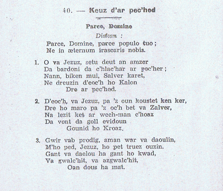 Nos cantiques bretons ont pris en compte ce besoin de contrition du pécheur, entre autre : le cantique « Keuz d’ar pech’ed » (le regret du pécheur) a comme refrain le Parce Domine. Dire que ce cantique est aussi inconnu que le Parce Domine, est une évidence. Il appartient, comme nous l’avons écrit dans un précédent article, à la longue liste des « cantiques pièces de musées, d’archives » que l’on tire exceptionnellement de l’oubli le temps d’un récital ou d’enregistrement d’un CD, et que l’on ne chantera jamais plus dans nos églises débretonnisées et vides …