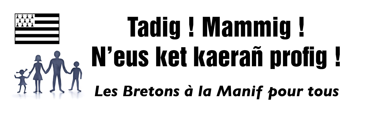 Nous vous avions présenté les affichettes proposées par Emglev an Tiegezhioù pour la Manifestation du 13 janvier dernier, affiches qui avaient été ainsi reprises en nombre. Des banderoles seront déployées lors de la prochaine manifestation à Paris, le 24 mars prochain. Ces panneaux (autorisés par le Collectif pour tous) sont téléchargeables directement sur le site d’Emglev an Tiegezhioù (Entente des Familles Bretonnes). A noter que cette association a mis en place deux cars (au départ de Landivisiau et de Carhaix), appelant à manifester derrière une forêt de Gwenn Ha Du (drapeau breton) pour faire comprendre leur opposition face aux députés bretons (dont Erwann Binet, rapporteur du projet de loi). Voici leur communiqué :